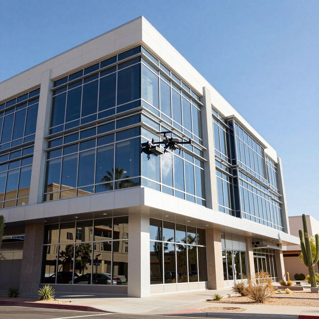 Precision cleaning of commercial windows and glass surfaces using drone technology to reach high and difficult areas safely and efficiently.